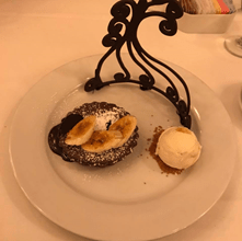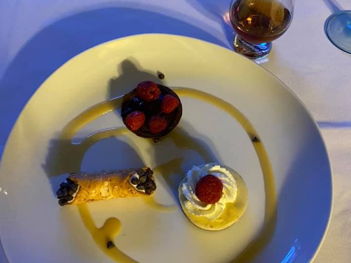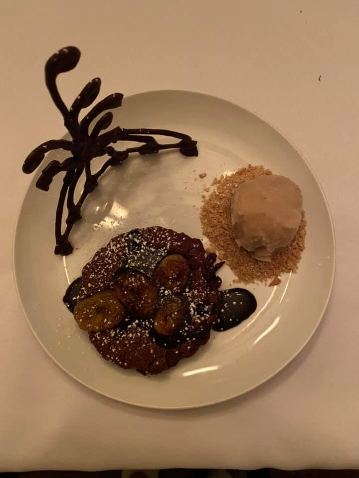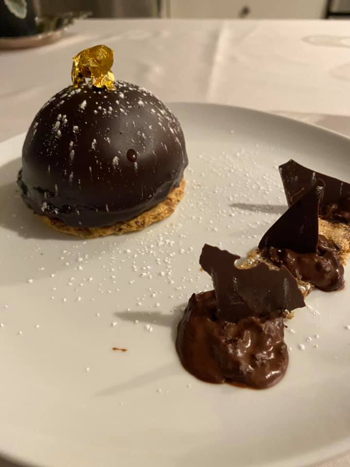 Chocolate Mousse Dome on Praline Crunch At Victoria & Albert’s there is always a show-stopping dessert, plus selections of handmade chocolates (every video or review I have seen ends with the couple taking the chocolates in a box to go because they couldn’t eat any more), and the coffee service is a must. In reading the menu description, I interpreted it as a praline crunch cookie/wafer base, with a bittersweet chocolate dome filled with chocolate mousse inside, so that’s what I did. I started thinking that I would make a traditional Trianon Royal, omitting the dacquoise layer, but came up with my own instead. I made a sheet-pan sized thin layer of praline meringue (ground almonds and pecans, brown sugar, and egg whites) and set it aside to cool and dry. I lined a half sphere silicone mold with a thin layer of melted chocolate, then filled it with a rich homemade chocolate mousse and a dollop of caramel in the center and set it to chill. I carefully cut circles from the praline meringue to serve as a base. I tried to make a mirror glaze, but it wasn’t working, so I coated the domes in more bittersweet chocolate. This made a shell that made them too hard to eat, but they were still delicious. I took the leftover pieces of meringue and broke them into pieces and dust. I spread the leftover melted bittersweet chocolate on a piece of parchment and created thin shards. On a chilled plate, I spread melted milk chocolate and caramel in alternating dots, then placed the bittersweet chocolate shards standing up in them, covered the caramel with the meringue pieces and dust, placed the mousse dome on top of the meringue circle, dusted everything with powdered sugar, and then topped the dome with edible gold leaf. Though our eyes and stomachs were bulging, we did eat one of the extra domes I made before giving up entirely. Besides the issue with the hard chocolate shell, it was so decadent and delicious. We each had one on Sean’s actual birthday, and gave the rest away to friends because we had so much Baba in the freezer.