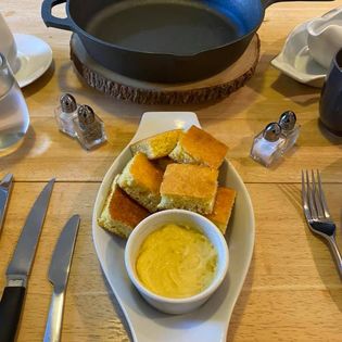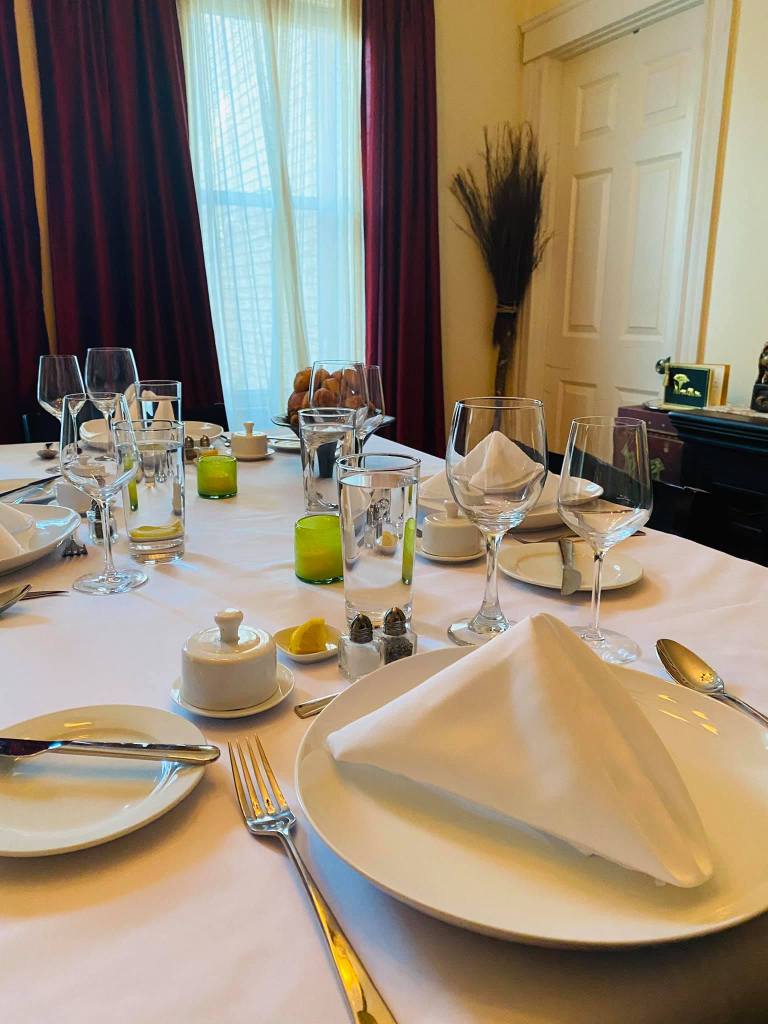 We took this photo after eating the poached Quail egg. It was sitting where the knife is, with chopped parsley and cracked pepper on top.