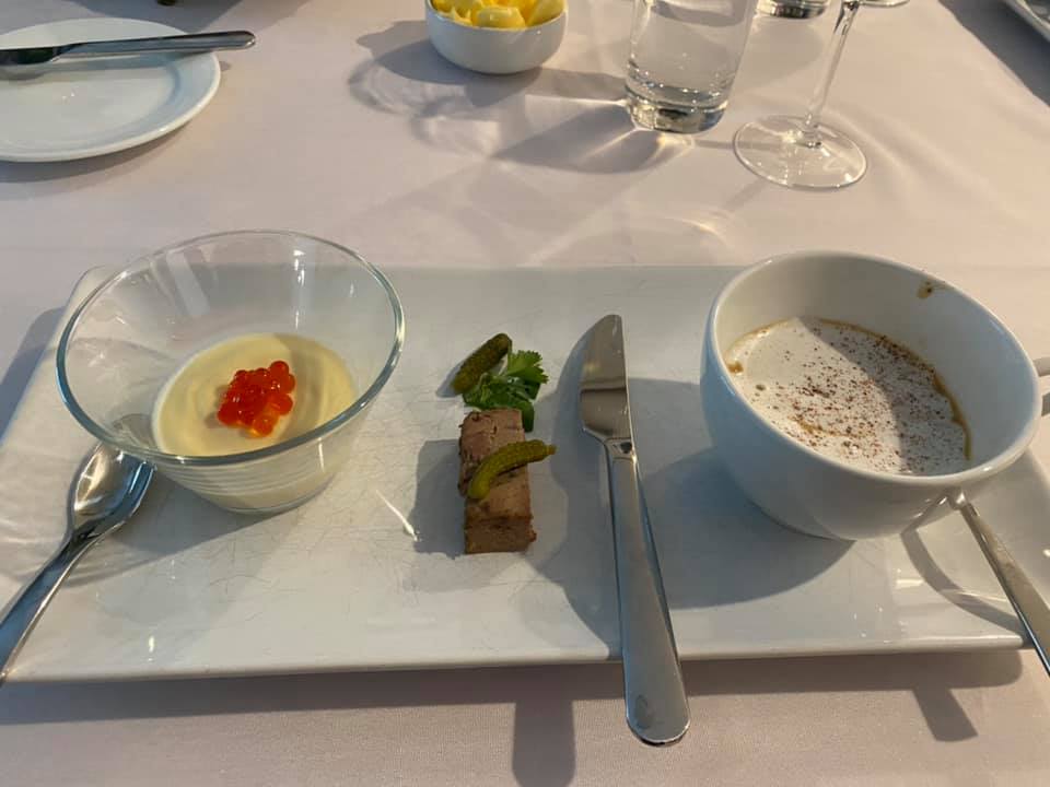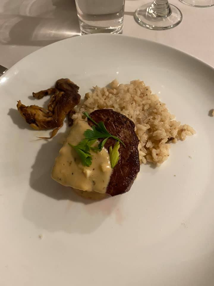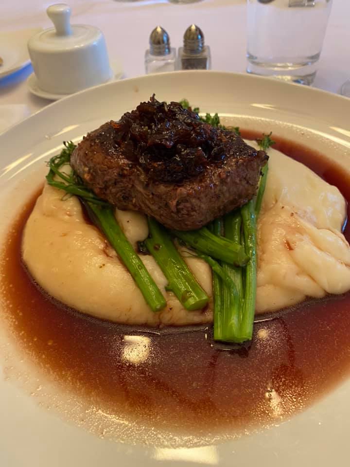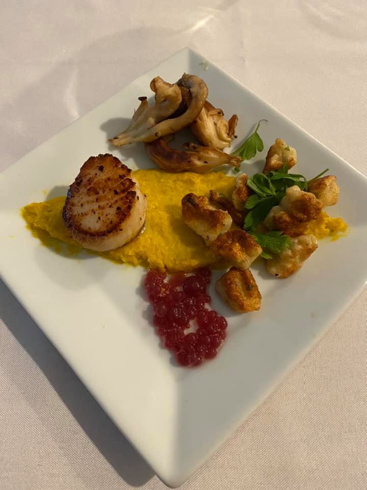 Soft Poached Quail Egg with Wild Salmon Caviar, Chicken Liver Terrine, Cauliflower Panna Cotta, Porcini Mushroom Cappuccino I started with the Panna Cotta, confident in my skills after making the dessert version for Jiko. The terrine was purchased (I’m not that extra!), and I found wild salmon roe online. We had once been served Mushroom Cappuccino as an amuse-bouche at a little Bistro in Plymouth, MA that no longer exists, and I’ve often thought about trying to make it at home. I found this recipe, and it was just as I had remembered it, so silky smooth and delicious. I don’t know if you’ve ever tried to poach an egg, but think of that on a micro scale. Quail eggs are absolutely tiny, and their thick shells need to be cut with a serrated knife. I used a very shallow, small pan and created a mini-whirlpool, then dropped the egg into the center so it would cook and stay in one piece. I made several and took them out with a slotted spoon to dip into an ice bath to stop their cooking. Then I put them on a wet plate and had them sitting ready to be warmed-through in simmering water when dinner came. When it came time to serve, all I needed to do was make sure the cappuccino was hot, warm-through the egg, and present it.
