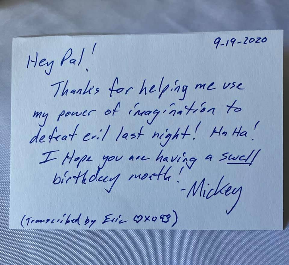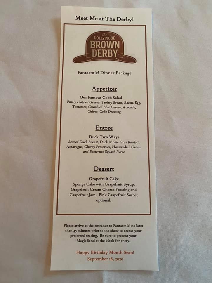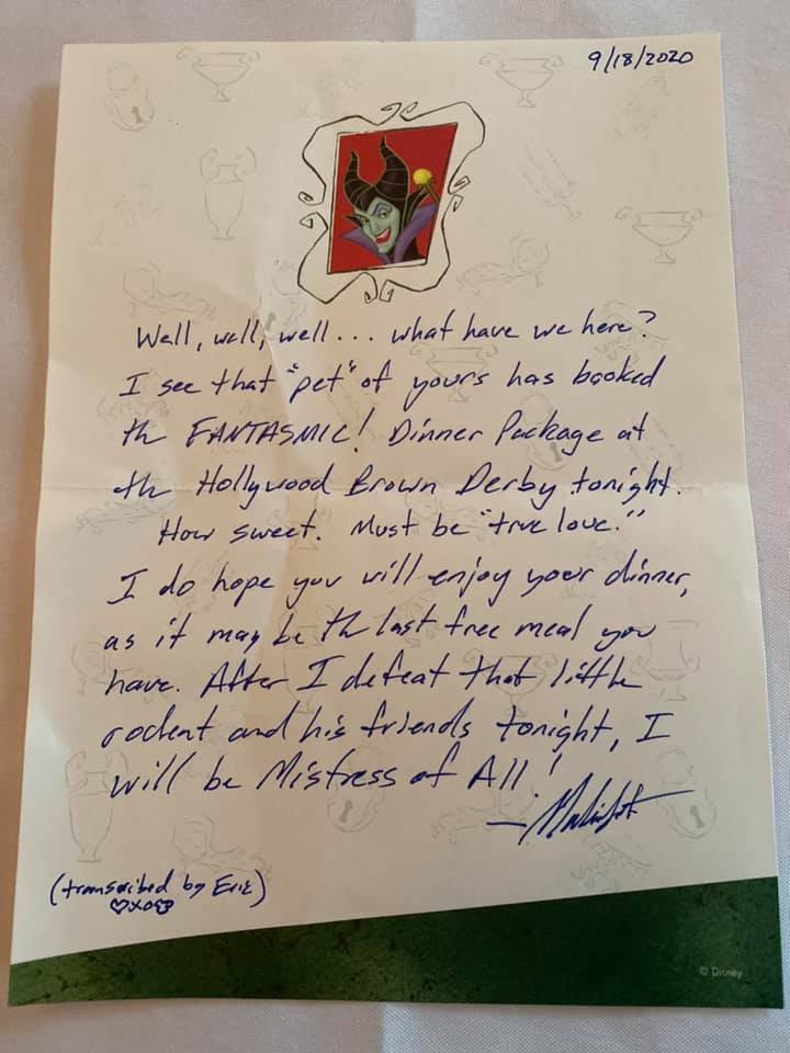 At the end of Part 4, we had dinner at the Hollywood Brown Derby on the second-to-last Friday night, and Sean received a card from Mickey on Saturday morning thanking him for his help in defeated Maleficent during Fantasmic! On Sunday, he received this (perfectly themed) card (right). Inside, it read:
