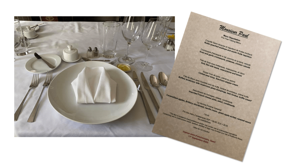 As I mentioned last time, when planning a WDW vacation, we tend to book the Signature Dining ADRs first, and then work our parks schedule around when we can get in. Hands down, the first in-park restaurant we book is always Monsieur Paul at Epcot World Showcase’s France Pavilion.
