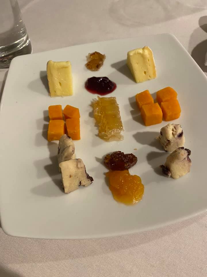 Selection of Cheese from the Market: Sparkenhoe Red Leicester, Blueberry Wensleydale, Organic Von Trapp Oma; Vanilla Gelato with Plum Compote and White Chocolate At this point, all of the live cooking was done. The problem was, so was Sean. While I had skipped the shrimp and salmon, and had only a bit of the filet, he had eaten everything, plus bread and butter, wine, and a cocktail beforehand. I had served too much food, and he could not eat any more at this point. I still presented each remaining course to him so he could experience everything and continue taking his pictures to post. In the restaurant, the cheese cart comes to you and you choose (or have the waiter choose) a few things to taste. I chose these three for taste, color, and texture variety, and paired them with a Bourbon Bacon jam, cherry preserves, honey in the comb, fig jam, and apricot preserves. What really confused me in all of the menus that I saw was the addition of the gelato with compote and chocolate alongside the cheese course, but it (or something similar) was there in every single menu that I found. Perhaps, like the cake and sour cream ice cream at the start, it was a palate cleanser. I made the plum compote and bought the vanilla gelato, making quenelles and freezing them. Not pictured were the white chocolate shavings I was planning to add to the top. We enjoyed the cheeses the next day, as well as the compote and gelato.