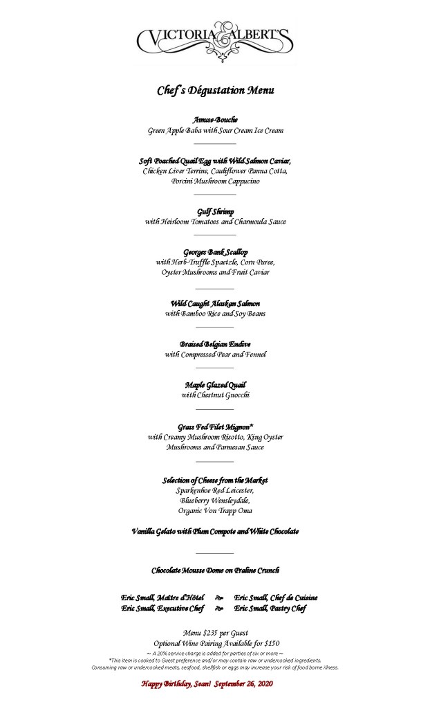 The beauty and draw of Victoria & Albert’s is not only the fine décor, the exceptional staff, and the AAA 5-diamond cuisine, but that the menu is constantly changing, especially at the Chef’s Table, where we would be eating (in actuality, we probably would have eaten in the dining room, but I took artistic license for logistical reasons – more below). This proved to be a challenge and a boon. While I could find the Chefs Degustation Tasting Menu from November 2019 on the official website (plus Vegetarian version), I also found posted menus from many guests before and after that date with completely different courses, and had many back-up ideas from menu items I didn’t pick for previous meals. using all of these sources, I came up with my own 10-course menu: