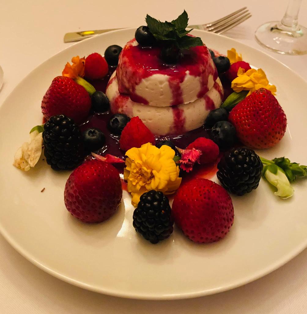 For the dessert course, I had already plated the Vegan Panna Cotta (with edible flowers and berries) and chilled it, so it came out during our appetizer so it wouldn’t be too cold. I warmed the berry sauce and poured it over just before presentation.