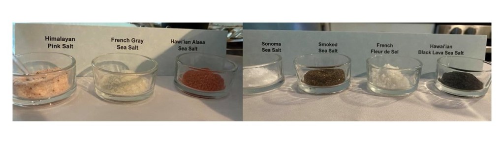 I kept Sean out of the kitchen all day as I laid-out the 10 different dishes I’d be using and started pre-plating what I could off to the side. I set the kitchen island up as the Chef’s Table with tablecloth, napkins, serving utensils, water and wine glasses, bread basket, and salts. One of the things not listed on the official menu that everyone comments on during their videos or reviews is the parade of breads and butters that come out between each meal. They are usually presented as quenelle, molded, or in crocks. I did not have the time nor wherewithal to create eight different breads and butters, so I had a basket of epi bread broken into individual baguettes and Kerrygold unsalted Irish butter in individual crocks. To mimic the variety, I purchased a set of sea salts and presented them on the table to flavor the butter.