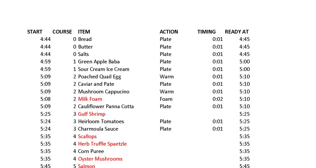 Run-Of-Show: With so many courses and so many small, fiddly bits of cooking and plating for each, I also needed to break-down the timing of everything. When we are having a regular dinner party (like with Jiko above), I always mentally plan-out the use of the oven and temperatures needed, the pots and pans needed, and the number of stovetop burners being used at one time. It’s also helpful to know how to time everything so that it is all done at the same time, so I sometimes have a sticky with times and temperatures that I refer to, to know when to throw the rolls in the oven, or to preheat it during dinner for the dessert, etc. I didn’t want anything to go wrong with these 10 courses, so I (of course) made a spreadsheet of all of the timing, and that became my run-of-show that night.