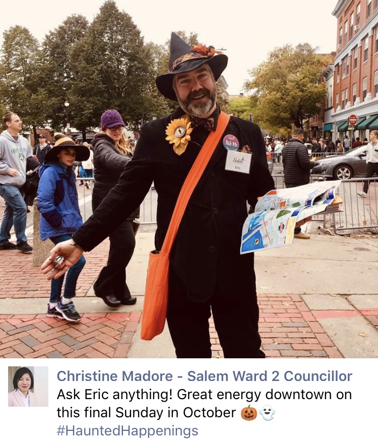Have you ever been to a Disney Park during school vacation? Our city’s historic and cultural district spans just over 1 mile in length, and half a mile wide when looking at the map, yet, we can reach half a million people in that area just on Halloween night. On one of my Saturday shifts at the booth last year, I helped 474 people in 2 hours! I am, what I like to call, “Aggressively Helpful” when working the booth. I will walk up to people looking at GPS on their phones, or trying to read the giant map nearby (for some reason, it’s posted backwards, which isn’t obvious when you look at it). If those people wave me away and say they know where they are going, 90% of the time they come back to me saying they got lost and needed help. I will compliment costumes, give a smile and a warm “Welcome to my city!” or “Happy Halloween!” to every person walking by. If it’s cold, I will tap a time step. I have had people come back to thank me for my suggestions and ask me for more, and I’ve had people recognize me from helping them the previous year – it’s like they have a friend that lives in Salem! We only count people that we actually talk to, but can include whole groups, even if we only talk to one person from that party. That’s probably how I got 474, although a 3.5 people-per-minute average is not hard to do with families or groups, especially if they have a specific question. I also hand out maps to even more people that I don’t count. The final Saturday before Halloween last year, we had a bad nor’easter come through. There were many intrepid travelers out on the streets that day, undaunted by the weather (and they had already paid for their trip, so why not?), and I still ended up helping 108 people in my 2 hours. The very next day, the storm had passed, and I was back up to 450. All totaled, I personally helped 1967 people (officially – I don’t count the ones I help when just walking around town). The entire booth staff of 75+ volunteers helped over 22,000 tourists that season.